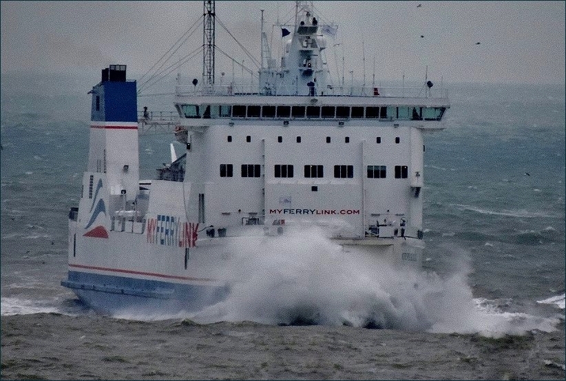 Top shot shows the ever busy Nord Pas de Calais which of course is a freight only vessel with MYFerryLink. A hard working vessel too and seems ever popular with the truckers. Below we have another pic from yesterday, this time from the afternoon which was perhaps a mite less rough, and we see the old favourite Calais Seaways again... battling homeward. Look at that crewman right on the bow and up at top right you can see the Captain (?) checking out the angle of lean !