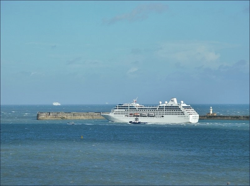 This pic above was taken at 6am yesterday and you can see the vivid pastel colours that are produced by the sun rounding the headland that time of the early morning. In the distance you can see one of several of yesterdays minor thunderstorms approaching us, the tail end of Hurricane Bertha still being felt. Below we have the evening departure through the eastern exit. The ship was heading for Rosyth where they are/were still feeling the very rough weather but hopefully by the time Ocean Princess got there everything was a mite calmer.