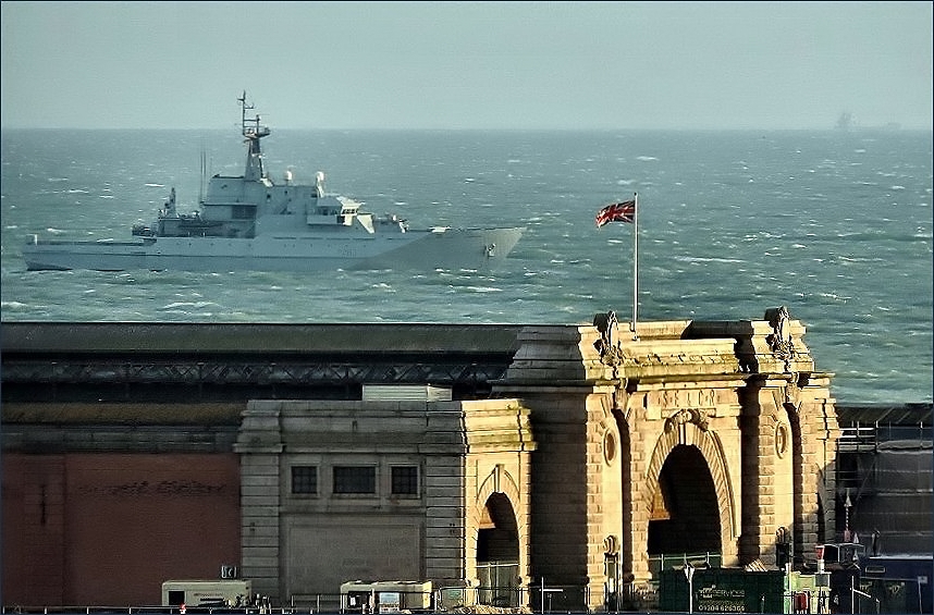 Yesterday evening this Royal Naval vessel in the pic below appeared just off the harbour. We have been seeing the UK Border Agency in this role recently...but this time it was the Royal Navy itself. The ship prowled, patrolled, and indeed lingered not far off Shakespeare Beach for a considerable time. They don't do the AIS information system but it appears to be HMS Mersey a "river class offshore patrol vessel". In the foreground you can see the newly restored façade of the dockside railway terminal...was it called Dover Marine one time?? But there we are anyway...long range pic taken in the lowering evening sun.