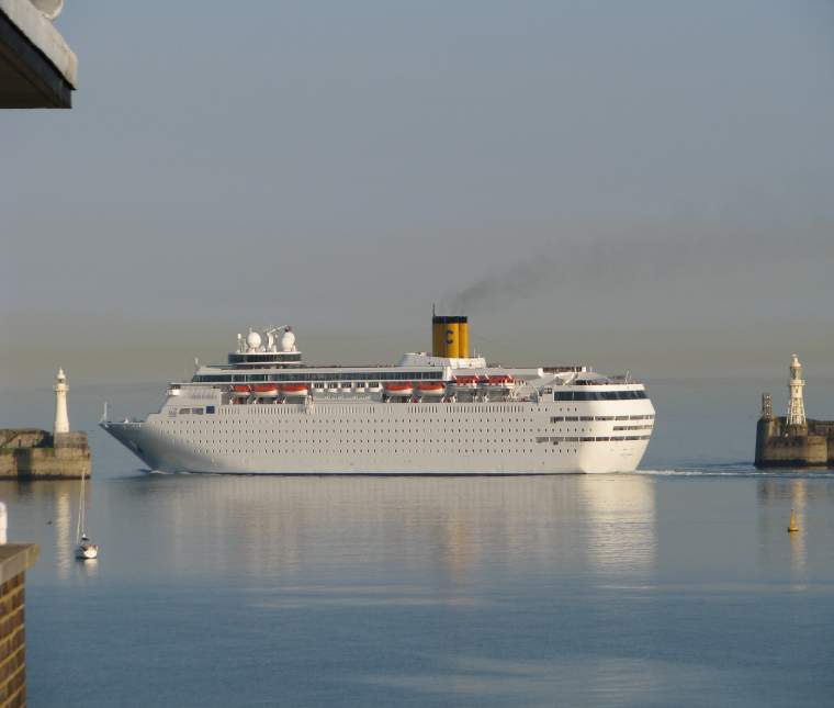 At approximately 53,000 tons it is not the biggest of the Costa ships to visit us here in Dover, but as always it is very impressive, beautifully Mediterranean, note as ever their usual and iconic twin yellow peaks..
